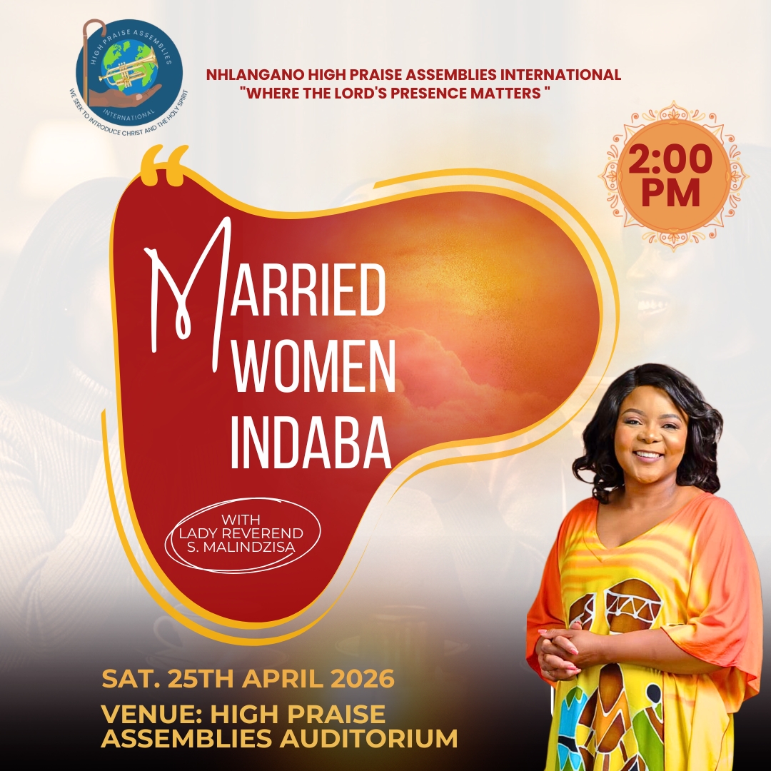 The Married Women Indaba is a dedicated gathering for married women to be strengthened, encouraged, and equipped for marriage and family life. Join Lady Reverend S. Malindzisa for a powerful time of wisdom, fellowship, and spiritual enrichment as we grow in purpose and grace within our homes.